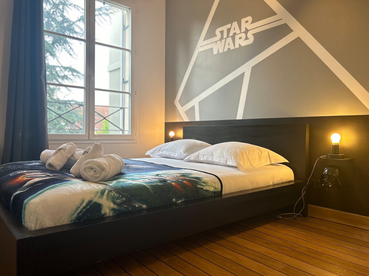 Udoban studio od 27 m2 za 4 osobe na tematici Diznilenda 7 minuta autobusom od parka i u blizini tržnog centra Val d'Europe/Vallée Village. 🔎 Idealna lokacija (u samom centru Magny-le-Hongre) i u blizini svih sadržaja: pekara, restorana, prevoza, golfa. Kompozicija 👪 : - Dva bračna kreveta (jedan visok 140x190, jedan bračni krevet 160x200🤩) 🛌 - Kupatilo (kada) 🛀 - Čajna kuhinja 🍔🍽️ - WC 🚽 - Besplatan privatni parking 🅿️ Vidimo se uskoro! ✌️🤠