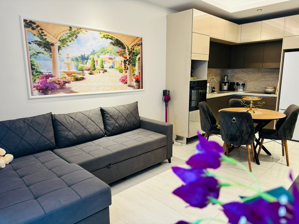 Apartmani u kompleksu Serenity Residence (premijum kompleks u gradu Mahmutlar). Autobus vozi do sopstvene zatvorene plaže kompleksa (2 puta dnevno / raspored se menja). Kuhinja-studio + spavaća soba. Potpuno nov, čist, dobro održavan stan - idealan za porodice sa decom (bazen za odrasle + dečiji bazen, sauna, teretana, radne sobe, prodavnica hrane i restoran - sve to na teritoriji kompleksa). Bićete iznenađeni prostranošću i udobnošću. Čekamo vas da nas posetite.