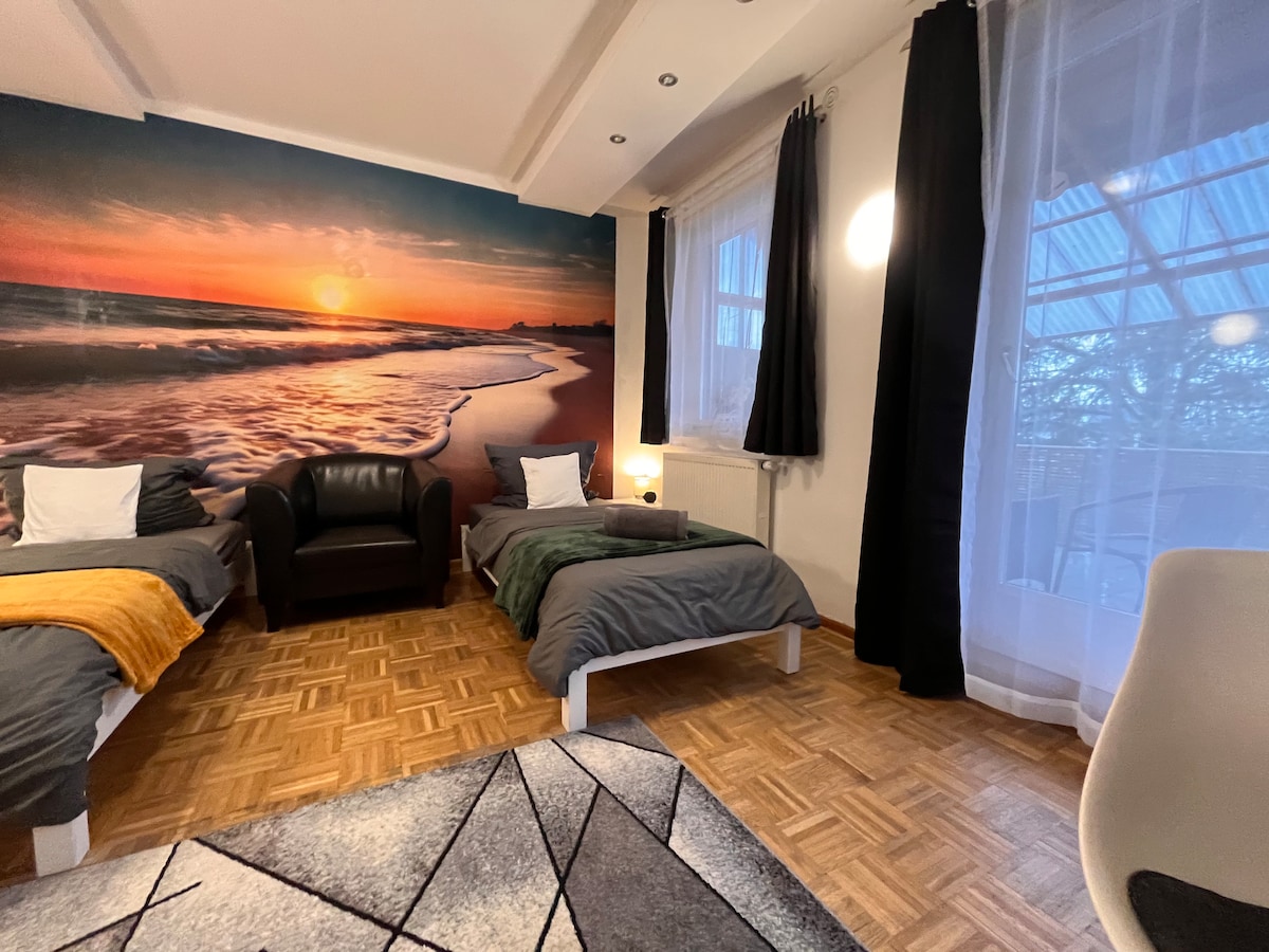Kako da vam poželim dobrodošlicu u stan na ulici! U bivšoj filijali banke, možete da očekujete 2 prostrane spavaće sobe sa bračnim krevetima i dovoljno prostora za prtljag. Prostrani dnevni boravak i trpezarija upotpunjuju garderobu u ulaznom prostoru kao i kancelarijski ugao. Kuhinja vam nudi sve što vam je potrebno, kao i mali bar sa kafom i čajem, što će vam olakšati da započnete dan. U kupatilu možete da očekujete veliki tuš sa kišnim tušem i grejačem peškira!