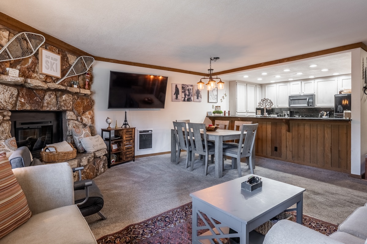 Ova svijetla i svijetla dvosobna jedinica je savršena mješavina modernog i udobnog. Dvospratna jedinica u uglu znači dodatno sunce i niko ne gazi po jedinici iznad vas! Uživajte u toplini kamina na drva nakon skijanja. -300 Ft do stanice Green Line (Eagle Lodge Shuttle) -500 stopa do stanice Purple Line (seoski šatl) 1,4 milje do sela -5,4 milje do Glavne kolibe -0,6 milja do prodavnice namirnica -32 milje do prolaza Tioga (Nacionalni park East Entrance Yosemite, samo leto)