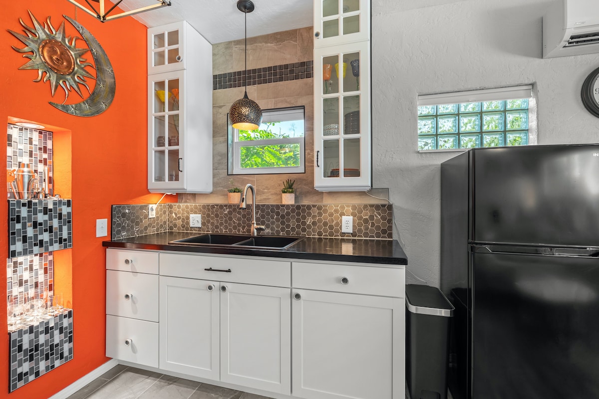 Jedna ulica udaljena od zaliva Sarasota - potpuno renoviran i potpuno namešten stan za goste sa atmosferom dekoa u Majamiju. Jedinica ima nešto više od 300 sf sa kompletnom kuhinjom, jednim kupatilom sa tuš kabinom, udobnim bračnim krevetom, nekoliko stolica/ stolica, TV-om sa ravnim ekranom, Wi-Fi mrežom, parkingom van ulice, šest USB portova za lako punjenje i prostor za sedenje na otvorenom na tremu. Pet minuta do centra grada ili aerodroma SRQ, 15 minuta do plaže Lido i 25 minuta do plaže Siesta sa lakim pristupom University Parkwayu ili Fruitville Rd.