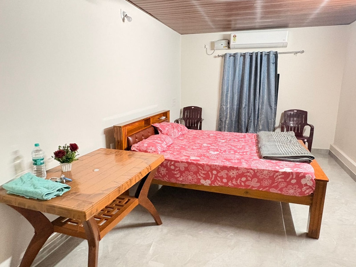 Prostrane sobe sa kupatilima. Dvije sobe imaju klima-uređaj, a jedna soba nije klimatizovana. 300 kvadratnih metara na prvom spratu sa zatvorenom terasom sa prelijepim pogledom Prostrani dnevni boravak s Wi-Fi mrežom i TV-om vrlo opuštajući Dostupan je objekat za peglanje odjeće i mašine za pranje veša Prekrasan pogled s krova Dostupna je prostrana kuhinja s osnovnim priborom Trpezarijski sto za 8 osoba Vaš boravak će biti nezaboravan, sa mnogo mira. Dostupni su Swiggy i Zomoto