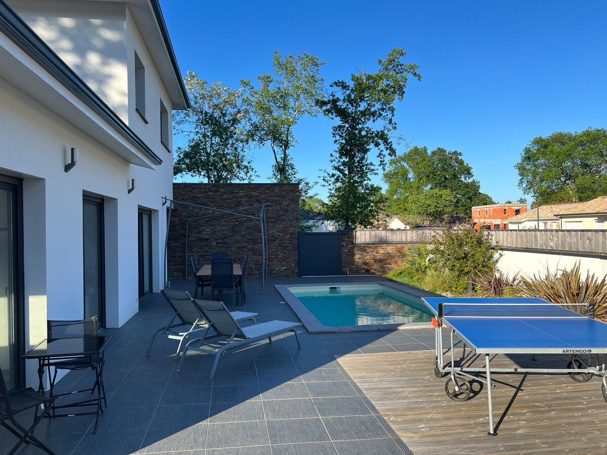 Podna vila od 135 m2 na ograđenoj parceli od 500 m2 sa bazenom. Kapacitet: 9 osoba. Sastoji se od 4 spavaće sobe, uključujući glavni apartman sa privatnom garderobom, tuš kabinom i WC šoljom, velikim dnevnim boravkom sa trpezarijom, opremljenom otvorenom kuhinjom, 1 kupatilom, 2 odvojena toaleta, ostavom. Spoljašnjost, terasa, bazen, roštilj, petanque teren, ping ping sto, trpezarija. Na pola puta između bazena Arkašona i Bordoa. Prodavnica mješovite robe udaljena manje od 4 km