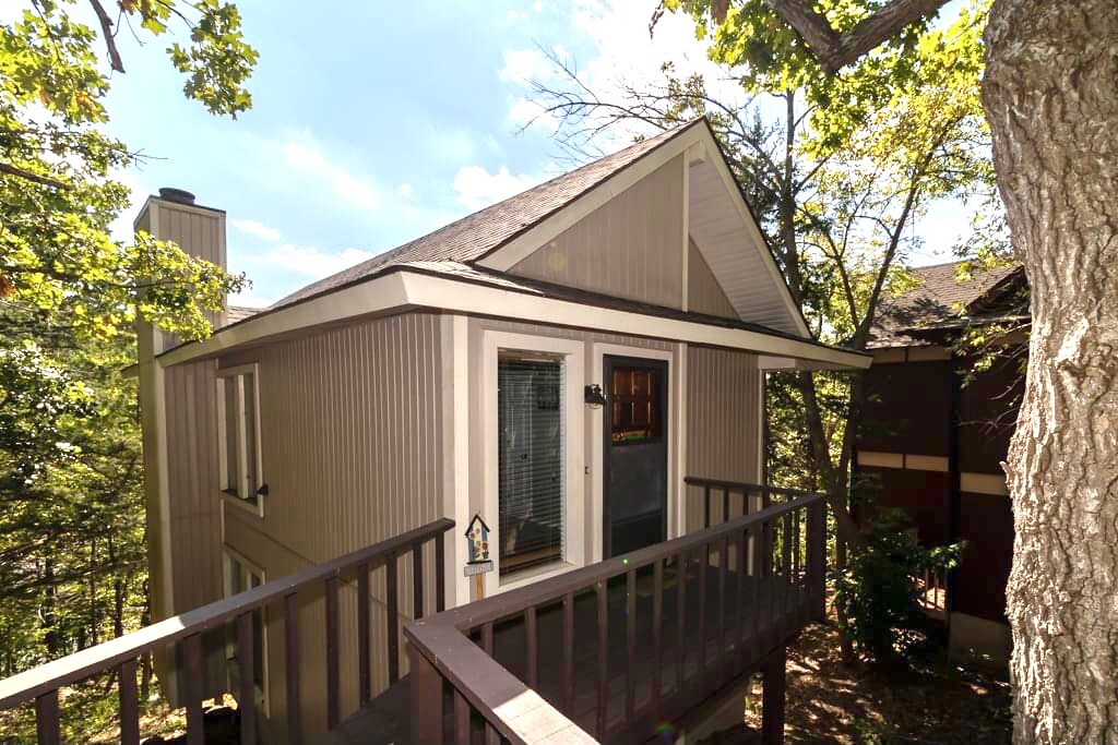 Rustic charm + Modern amenities. Our 1930's Cabin rests atop one of the most sought after view corridors at the lake. Over 100 feet above the water offering views of local Firework shows, gorgeous sunsets and a spectacular vantage point when there is activity on the lake. Nestled away in the wilderness, peaceful days and nights are many. Located in the heart of Osage Beach with nearby lake access at the state park, steak house adjacent to property and a wine bar.