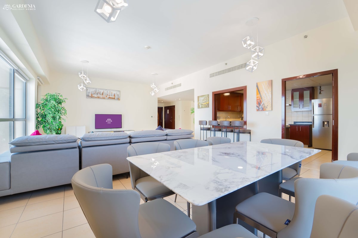 Probudite se uz pogled na more koji oduzima dah i legendarni Ain Dubai pravo sa prozora. Ovaj prostrani dvosobni apartman udaljen je samo 2 minuta hoda od plaže JBR i udobno prima do 8 gostiju, savršen je za porodice i grupe koje traže prostor, lokaciju i vrednost. Nalazi se u srcu naselja Džumeira Bič, na nekoliko koraka od Šetališta, restorana, kafića, supermarketa i plažnih klubova.