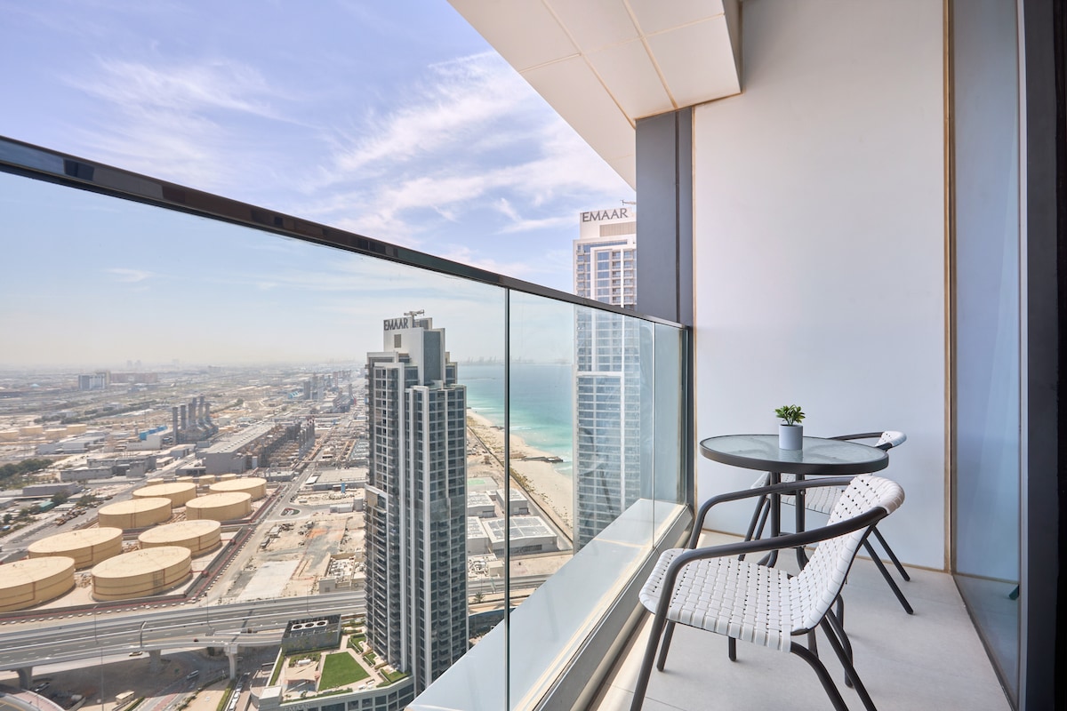 Doživite luksuz na 48. spratu odmarališta Address Beach, sa spektakularnim panoramskim pogledom na more. Prostrane i elegantne sobe, spavaća soba sa privatnim kupatilom, dva kompletna kupatila, privatno ledeno kupatilo i sauna, potpuno opremljena najsavremenija kuhinja i veliki namešteni balkon. Pristup privatnoj plaži, bazenu, teretani koja radi 24 sata, krovu sa ekskluzivnim restoranima, prestižnim zajedničkim prostorima i privatnom parkingu.