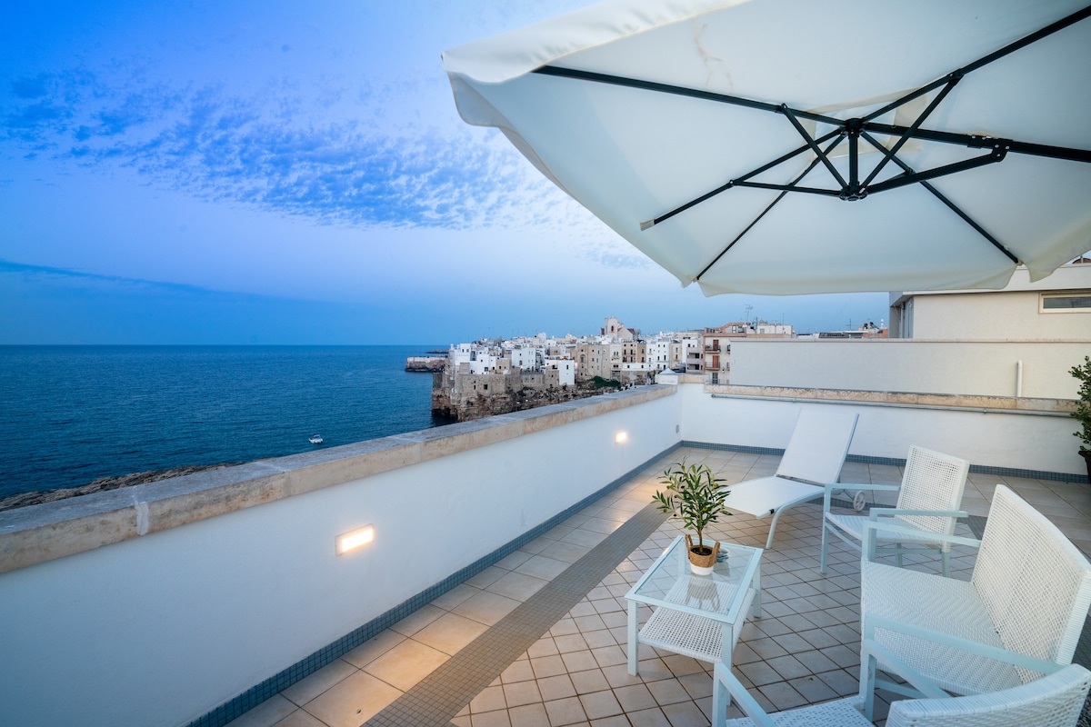 Soggiorna in questa meravigliosa dimora d'epoca di 70 mq. nel centro storico di Polignano a mare con vista mare, gli ambienti sono ricercati, per valorizzarli in questa dimora del 700, abbiamo preferito i materiali tipici del nostro territorio, le pareti e le volte sono realizzate con gli intonaci naturali, i pavimenti e i rivestiti del bagno il protagonista è il cocciopesto, la terrazza con vista mare mozzafiato e centro storico.