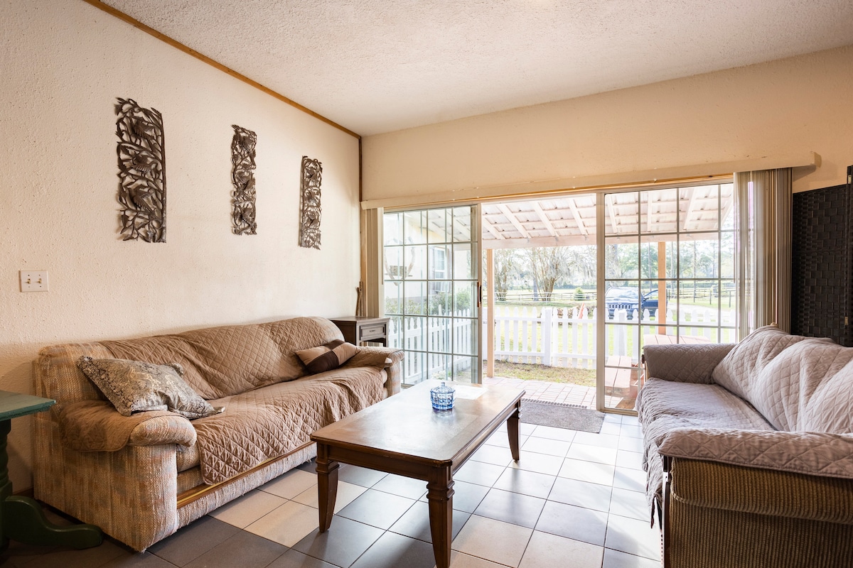 Добродошли у наше шармантно сеоско уточиште, савршено за опуштајући одмор. Смештено поред живописног земљаног пута, наше имање нуди прави бег. 2 хектара потпуно ограђено од фарме ради ваше приватности, идеално је за госте са псима и нуди простор за вечерње ватре. 6,4 км од WEC-а, 3 км од FAST-а и оближњег Флорида Спрингса. Уживајте у лепоти наших обилних храстова, дивљих животиња и пријатељских домаћих животиња.Dostupne su obilasci farme. Doživite spokoj i rustični šarm života na farmi sa modernim pogodnostima u blizini.