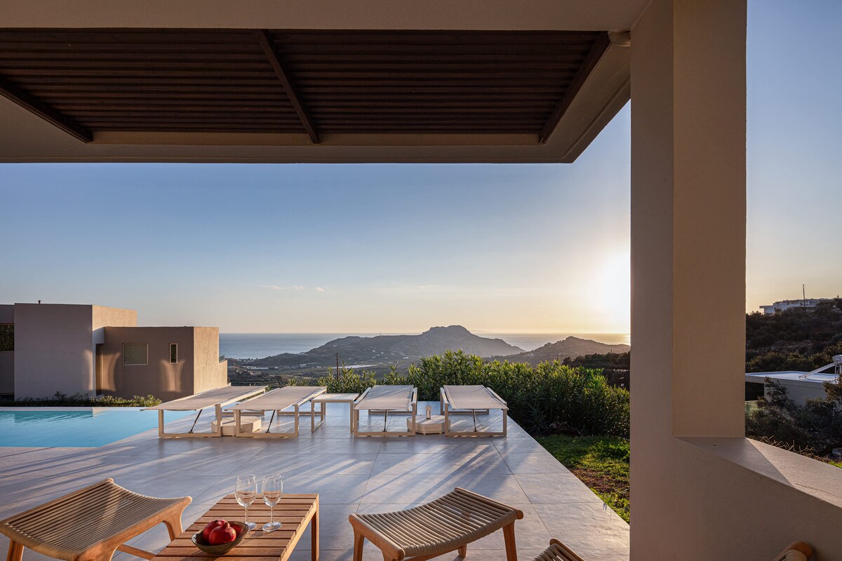 Ova arhitektonski dizajnirana vila nudi zadivljujući pogled iz svake sobe, predstavljajući prekrasan spoj minimalističkog dizajna sa prirodnim okruženjem južnog Krita. Uključivanje masline koje raste kroz krov terase i upotreba lokalnog kamenja i materijala naglašavaju povezanost sa životnom sredinom. Sve spavaće sobe imaju privatna kupatila i pružaju panoramski pogled na brda, planine i more.