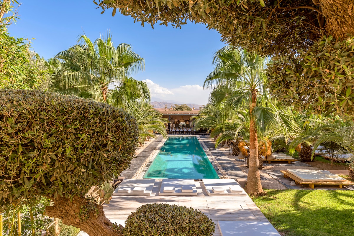 Escape from the bustle of Marrakech into a contemporary sanctuary at Villa Kallaris. This beautiful vacation rental is tucked away in a lush private garden just steps from many of the city's must-see attractions, including the Majorelle Garden and the new Yves Saint Laurent Museum. Invite up to eight friends or family members to share a honeymoon from the everyday in its refined interiors and four suite-style bedrooms. Your holiday at Villa Kallaris includes the services of a cook, housekeeper and gardener. Spend your stay soaking in the sun on a lounger by the pool, sipping mint tea beneath the palm trees and bougainvillea at a table in the garden, enjoying meals fresh off the barbecue at the shaded al-fresco dining area or watching the stars come out from the rooftop terrace. The villa also boasts high-tech amenities such as a TV, sound system and Wi-Fi. Though this luxury residence dates from the 1930s, it was recently redesigned by Roger Herrera based on the principles of architect Robert Mallet Stevens. Those principles are evident in the home's clean lines, large windows and thoughtfully selected furnishings, which create an atmosphere of sophisticated calm. Several sitting areas are perfect for quiet moments with a book, while the elliptical dining room is ideal for gathering together. Each of the four bedrooms at Villa Kallaris has a queen bed and en-suite bathroom; three of the four bedrooms also open to a terrace. Richly colored terrazzo floors, soft textiles and bold artwork make each bedroom a stylish retreat. With the Majorelle Garden and the new Yves Saint Laurent Museum just steps away, the villa makes it easy to explore the city on foot. Bargain for spices, leather goods, souvenirs and more in the souks, dine out at up-and-coming restaurants or spend hours wandering through the medina, a UNESCO World Heritage Site. Copyright © Luxury Retreats. All rights reserved. BEDROOM & BATHROOM • Bedroom 1: Queen size bed, Ensuite bathroom with stand-alone shower & bathtub, Dual Vanity, Access to terrace • Bedroom 2: Queen size bed (or 2 Single size beds), Ensuite bathroom with stand-alone shower & bathtub, Dual Vanity • Bedroom 3: Queen size bed, Ensuite bathroom with stand-alone shower & bathtub, Dual Vanity, Access to terrace • Bedroom 4 - Primary: Queen size bed, Ensuite bathroom with stand-alone shower & bathtub, Dual Vanity, Safe, Desk, Access to terrace FEATURES & AMENITIES • View of Jardin Marjorelle • More under “What this place offers” below Included: • Gardener (lives onsite) • More under “What this place offers” below Extra cost (advance notice may be required): • Swimming pool heating - 2000 MAD flat fee + 400 MAD per day • Activities and excursions • More under “Add-on services” below