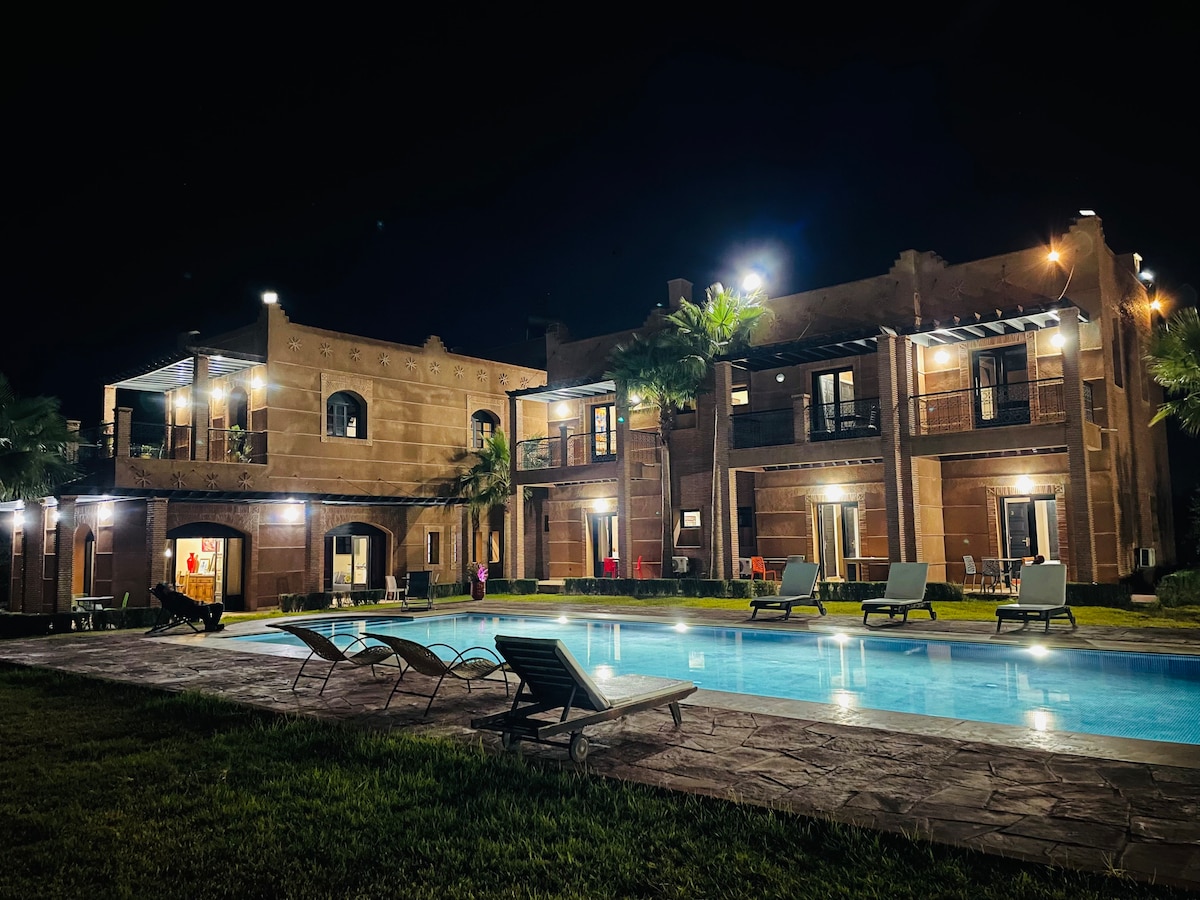 Predivna nekretnina s pogledom na Atlas koja sadrži četiri velika apartmana i četiri "mala" apartmana; svaki od njih ima svoje kupatilo i toalet. Vila ima veliki bazen i baštu. Hamam je takođe dostupan na zahtev. Prefinjena marokanska kuhinja na zahtev. (Za cene se obratite vlasniku).