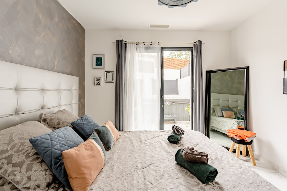 Počastite se romantičnim odmorom samo nekoliko minuta od Aubagnea. Ovaj apartman sa hidromasažnom kadom nudi intimnu atmosferu sa hidromasažnom kadom za dvije osobe, bračnim krevetom, mekim osvjetljenjem i Netflix-om. Uživajte u opuštajućem boravku uz mini-bar, doručak ili obrok. Savršeno za romantičnu noć, iznenadni odmor ili odmor za velnes. Samostalna prijava, mir i potpuna privatnost su zagarantovani.