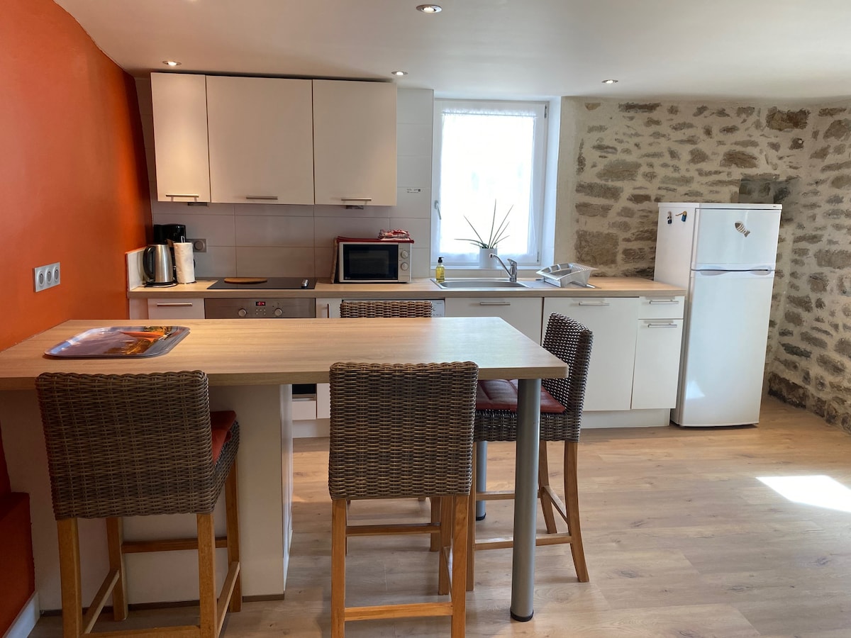 Ce gîte au cœur d'un village, a une pièce principale avec un coin cuisine (plaques induction, four mixte, frigo), un canapé, une table (rabattable) avec 4 chaises, une salle d'eau, et une grande chambre à l'étage, une table utilisable pour travailler ( wifi de bonne qualité), une commode, une penderie. Possibilité de manger dehors, et d’utiliser la piscine.