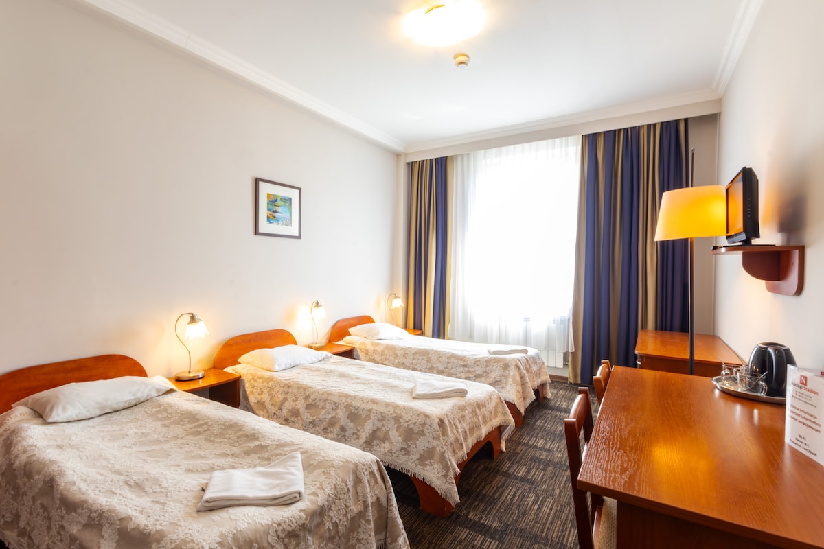 Pokój dwuosobowy z dwoma oddzielnymi łóżkami pojedynczymi oraz prywatną łazienką. Na wyposażeniu pokoju: prysznic, toaleta, telewizor, lodówka , czajnik oraz Wi-Fi. Wszystkie udogodnienia znajdują się w pokoju. W łazience dostępne są żele pod prysznic, szampony oraz suszarka do włosów.