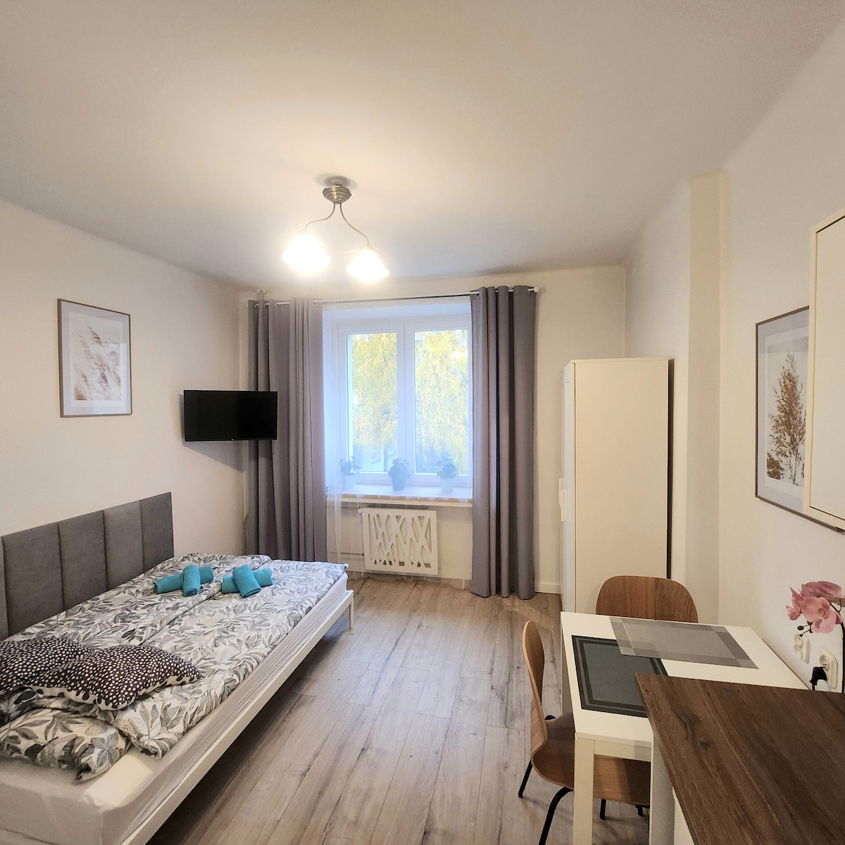 Veoma lep stan. Tu je kuhinja sa dnevnom sobom, spavaćom sobom, kupatilom i balkonom. Iza zgrade se nalazi mala šuma kao i lep park. Oko 200 m od stana nalaze se tržni centar i bioskop. Za goste postoji parking ispod kuće sa posebnim smeštajem. U kuhinji za udobnost gosta nalaze se osnovno kuhinjsko osoblje kao što su kafa, čaj, šećer, so, ulje, začini itd. Noćna tišina važi između 22.00 i 06.00, tako da nije adekvatna za zabave.