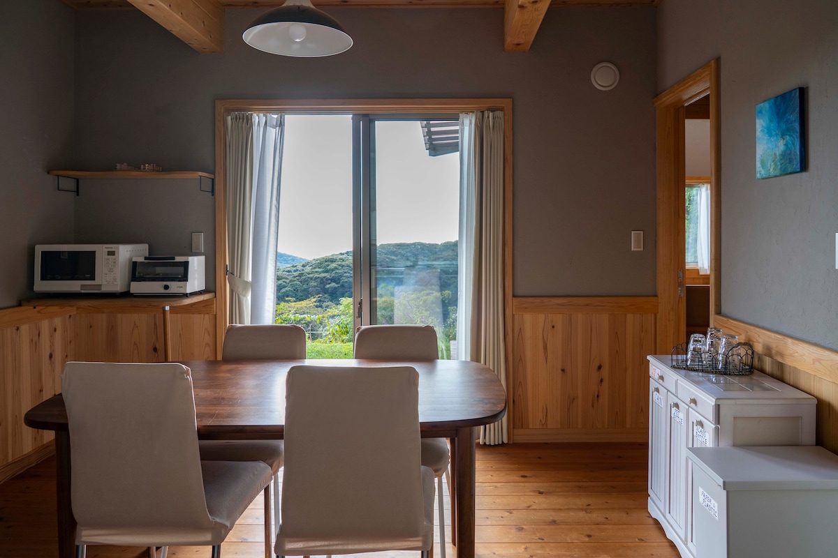 Doživite izuzetne zvuke prirode u seoskoj kući sa pogledom na okean. U nacionalnom parku Tanushi nalazi se seoska kuća koja prolazi kroz power spot Heart Cave Ryugu (model za Gibli's "Ponyo") i Tanushi Beach. Dok ulazite na ulazna vrata seoske kuće, zelenilo drveća i blistavo svjetlo okeana vam uskoče u oči.Dnevni boravak od 20 tatami sa visokim plafonom ima kauč, kuhinju, potkrovlje i kamin zimi i opuštajući je prostor za porodice i prijatelje. Kada izađete sa prozora na terasu, možete da vidite nebo i more kako se šire iz mora.Možete luksuzno da osjetite ugodan povjetarac i nebo koji polako teku u đakuziju i ljuljaški na visećoj ležaljci. Sa terase se popnite još jednim spratom do nebeske terase.Postoji samo priroda dokle god pogled seže.Krajolik koji oduzima dah širi se. Opušteni protok mora i ribarskih brodova u Izuu možete da čujete zvuk ptica u potoku.To je sjajna detoksikacija. Zatim se spustite na jedan sprat i uživajte u roštilju na ugalj dok slušate žamor rijeke u šumi.Bilo je ukusno, zabavno i sa sjajnom uspomenom. Noću, zvjezdano nebo blista, a ako je vrijeme lijepo, možete da vidite zvijezde padalice!Možete uživati u ljepoti neba.