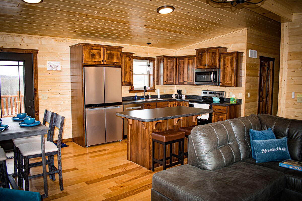 Amiš Paradajs ima koncept otvorenog sprata sa dnevnom sobom, trpezarijom i kuhinjom na prvom spratu. Na drugom spratu su 3 spavaće sobe. Penjući se stepenicama, imamo bočni pogled koji gleda kroz lučni prozor u šumu. Međutim, naš omiljeni deo ovog doma je pogled sa palube!! Ima Vista koja gleda na našu imovinu i dalje u Marti Park! Da li sam spomenuo da je ova kuća nekada bila pravi dom Amiša?😉