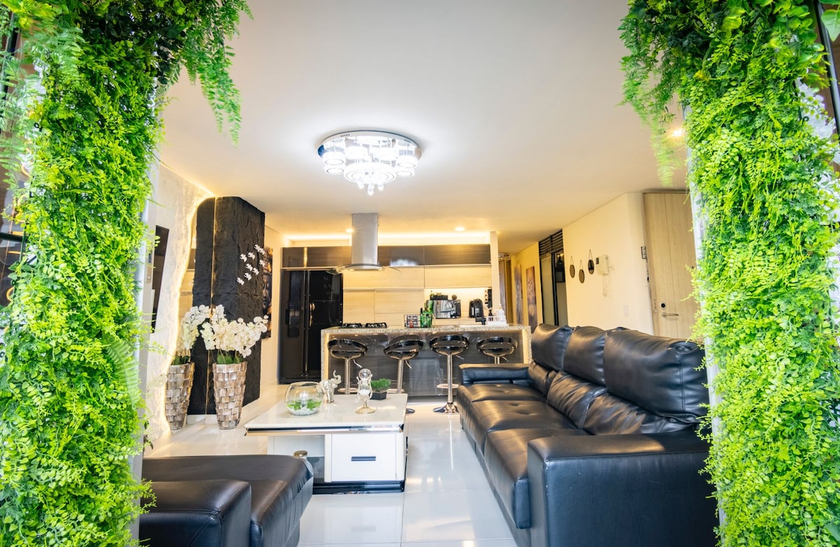 Ovaj jedinstveni dvospratni penthaus je jedan od najboljih objekata u cijelom Medeljinu. Dizajniran posebno za Amerikance i strance koji žele da imaju nevjerovatno putovanje u Medeljin. Ovaj penthaus je dupleks i sadrži: • Spoljni bar sa TV-om •Mini golf •Džakuzi •Bioskop • Sto za bilijar •Video igre •Mini Jumbatron • Ukupno 13 televizora •3 spoljna balkona •Neverovatan pogled na grad •Četiri spavaće sobe •Četiri kupatila •Internet •Mašina za pranje i sušenje veša