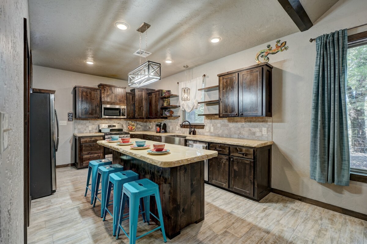 Enjoy luxury lodging in Medicine Park with creek & mountain views, walk to Cobblestone Row & Bath Lake. Sleeps 10 with 1 king, 1 queen, 1 full, 3 twin pullouts, & a sofa bed. Features 4 bedrooms-2 full bedrooms, 1 loft bedroom w/ door, 1 open loft bedroom overlooking main area, 2 baths,, full kitchen, new range. Across from Riverside Café and Parkside Tavern. Great for family vacations, romantic escapes, & wildlife adventures. Price based on # of guests, pets, time of year.
