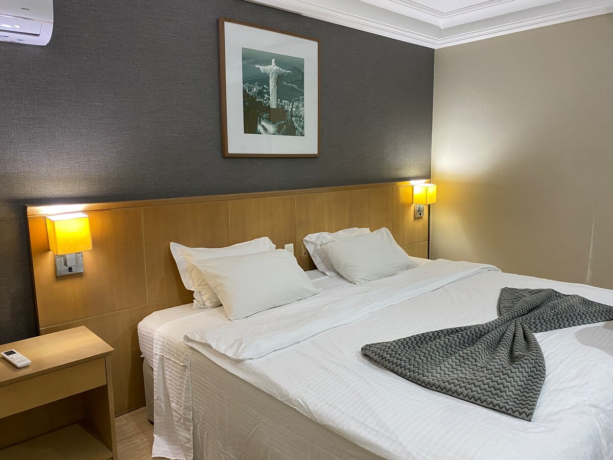 Standardni standard hotela: privatna soba sa kupatilom sa tuš kabinom na gas, balkon sa pogledom na more. Sva infrastruktura i usluge, uključujući trajekt za prelazak kanala i pješačenje 10 minuta do Post 6 da Barra. Enxoval bed and bath standard hotel+, option of 1 King bed or 2 beds. Ormar, mikrotalasna pećnica, aparat za kafu i električno kuvalo za vodu, minibar, Wi-Fi, kablovska televizija, split klima-uređaj. bazen, sauna, teretana, teniski teren, restoran, kafeterija, prodavnica, vešeraj, parking.
