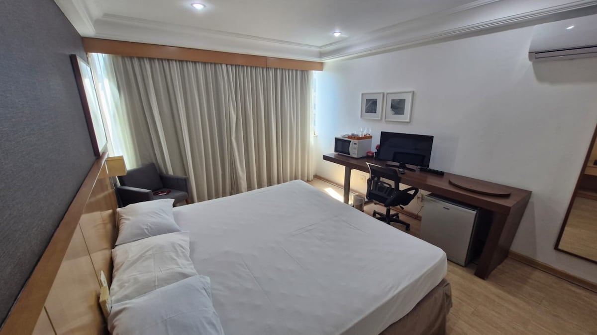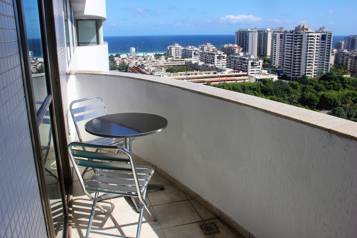 Suite com varanda e garagem na Barra da Tijuca! Arrumação inclusa 2 a 3 vezes por semana Espaco inteiramente reformado em outubro de 2024! Garagem coberta 24h em andar subterraneo Restaurante aberto de 7 as 23h todos os dias no condominio! Cama de casal king, TV smart, ar condicionado novo, varanda com vista para a piscina e muito mais!