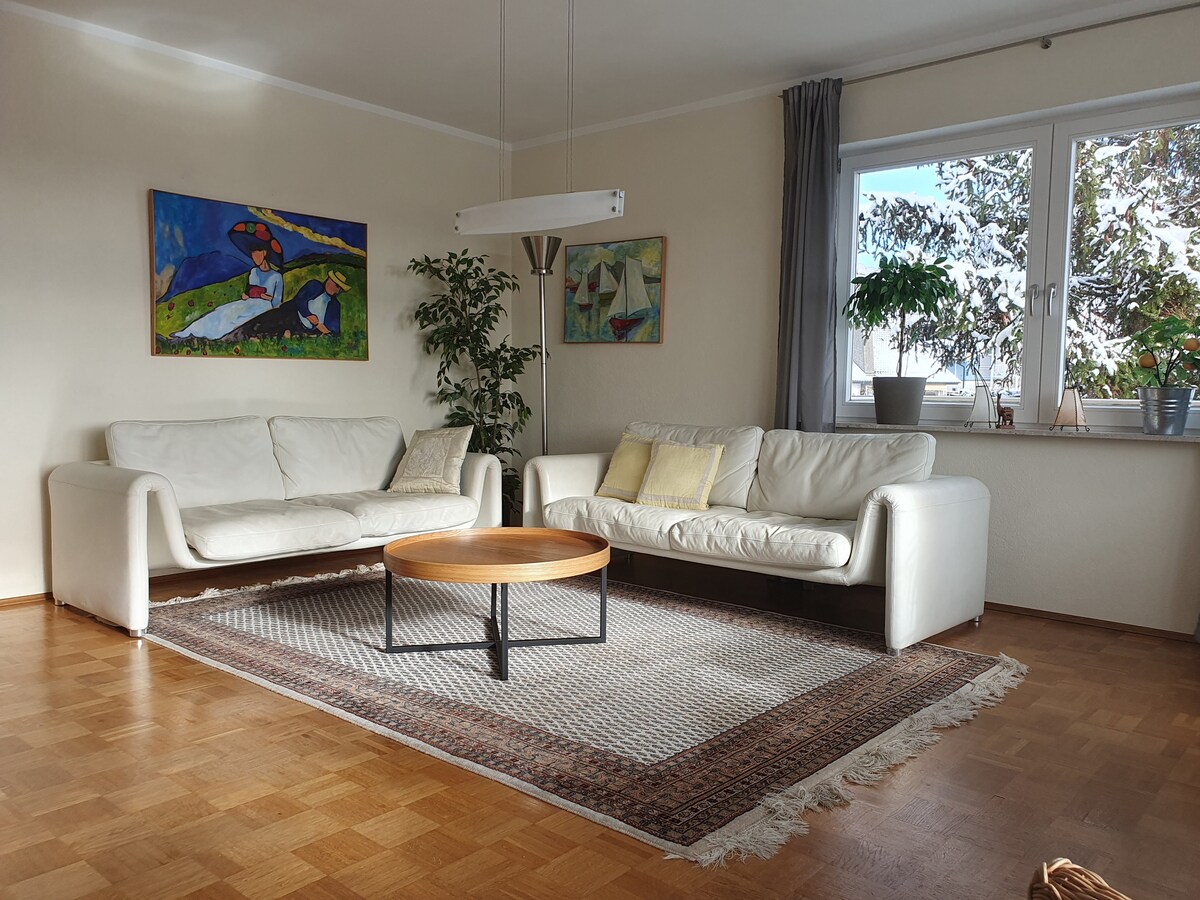 Poštovani praznični gosti, stan je površine 100 m2 i opremljen je veoma svijetlim i prostranim dnevnim boravkom, dvije spavaće sobe sa bračnim krevetima, veća ima dodatni krevet, modernu kuhinju i kupatilo sa tušem i odvojenim toaletom. Dnevni boravci i spavaće sobe, kao i hodnik, sa prirodnim drvenim podovima. Renovirani stan je udaljen oko 2 minuta hoda od istorijskog centra Meersburga.