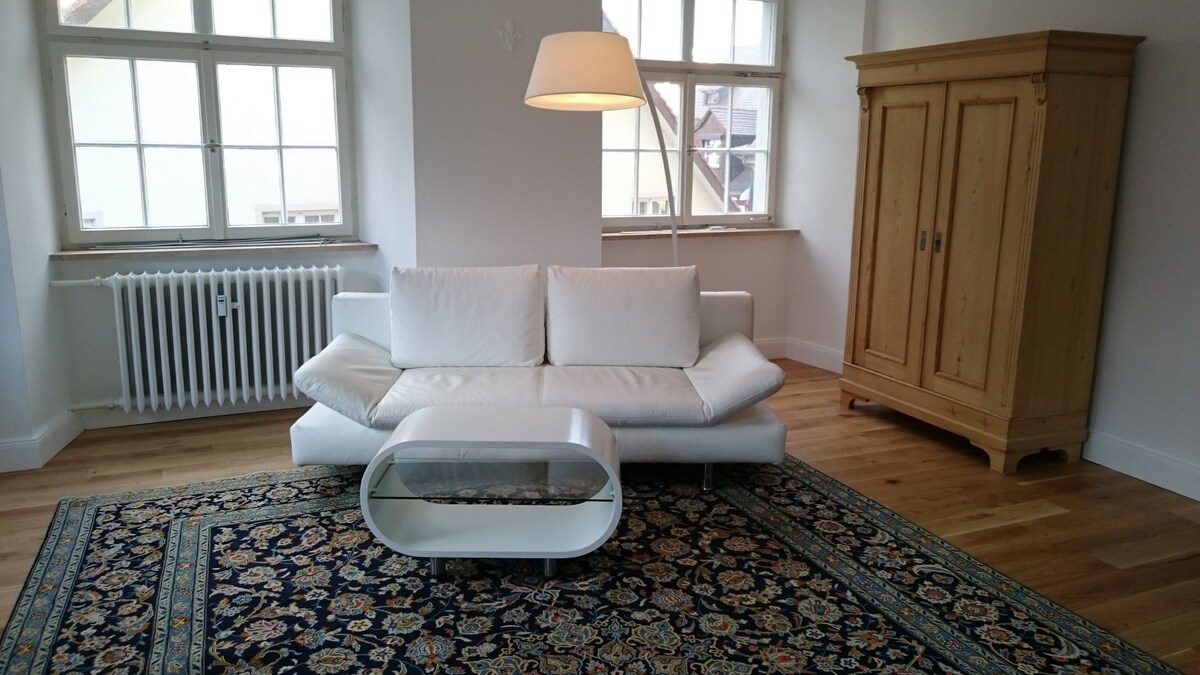 U našoj idiličnoj seoskoj kući u predgrađu Meersburga nudimo vam 2 renovirana stana. Stan „Istorika“ je jednosoban stan sa mnogo šarma u prizemlju sa terasom i malom baštom i pogodan je za dve osobe. Meersburg je udaljen 5 minuta vožnje. Odmorite se od svega, opustite se. Zahvaljujući našem sefu za ključeve na ulaznim vratima sa šifrom broja, možete fleksibilno da isplanirate putovanje i prijavite se od 15:00.