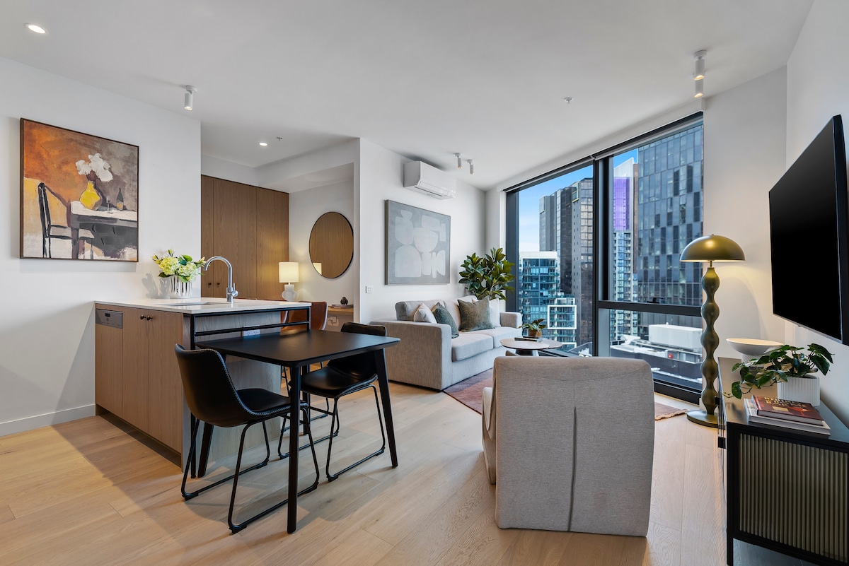 Experience Melbourne from this stylish, centrally located apartment with stunning bay and city views. This chic 44th-floor stay is the perfect city base. Enjoy premium amenities including a pool, gym & rock-climbing. Steps to cafes, restaurants & bottle shop, etc. Located in the Free Tram Zone, 200m from Southern Cross Station, Coles & Spencer Mall. Walk to Marvel Stadium, Crown Casino & Queen Victoria Market. Tram 96 offers direct access to F1 races, and an easy commute to the Australian Open.