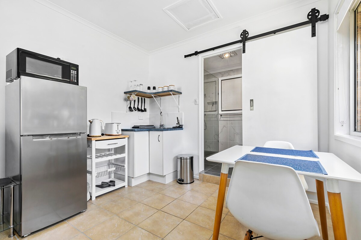 This cosy unit offers - A living area with a king single bed with massage features. - Separate bedroom with a double bed-available for bookings of 2 or 3 persons. - Tea, coffee, milk and basic breakfast supplied. Completely independent with your own kitchenette, microwave, small oven, cutlery and pans - Bathroom and powder room. Very convenient for business, study or short stays. Small/ mid size pets welcome, extra $25 per night! Make sure you include your pet in the booking message!