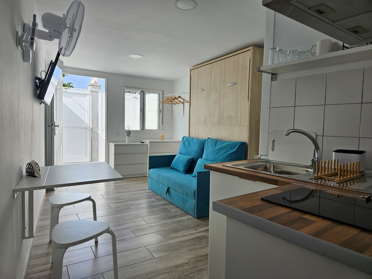 Estudio acogedor con una cama abatible de 1.35 x2 y un sofá , con cocina ,baño , terraza y ducha exterior, en una zona muy tranquila , a 15 minutos a pie está la playa de Maspalomas, el supermercado más cercano está a 8 minutos a pie, un estudio muy completo que dispone de todo lo necesario