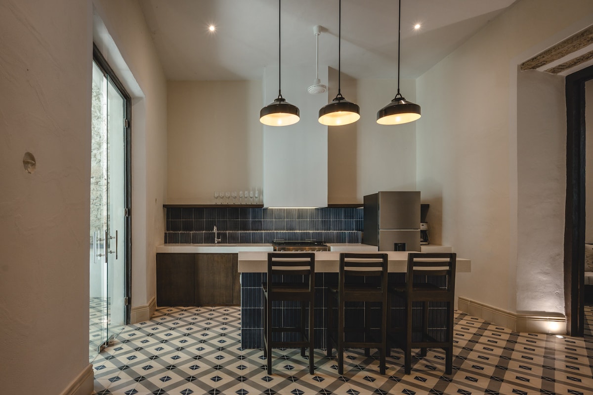Idealna baza za istraživanje Jukatana ili opuštanje u prelepom okruženju. Nalazi se u tihoj ulici u istorijskom centru Meride, kuća može da primi do 6 gostiju u tri spavaće sobe, ima zasebnu kancelariju/TV sobu za rad ili igru i ima veliku kuhinju/dnevni boravak/trpezariju sa mnogo prirodnog svetla. Možete se opustiti ispod palapa bazena ili u centralnom dvorištu prekrivenom vinovom lozom, napraviti roštilj na terasi na krovu ili uživati u zalascima sunca sa zvonika.