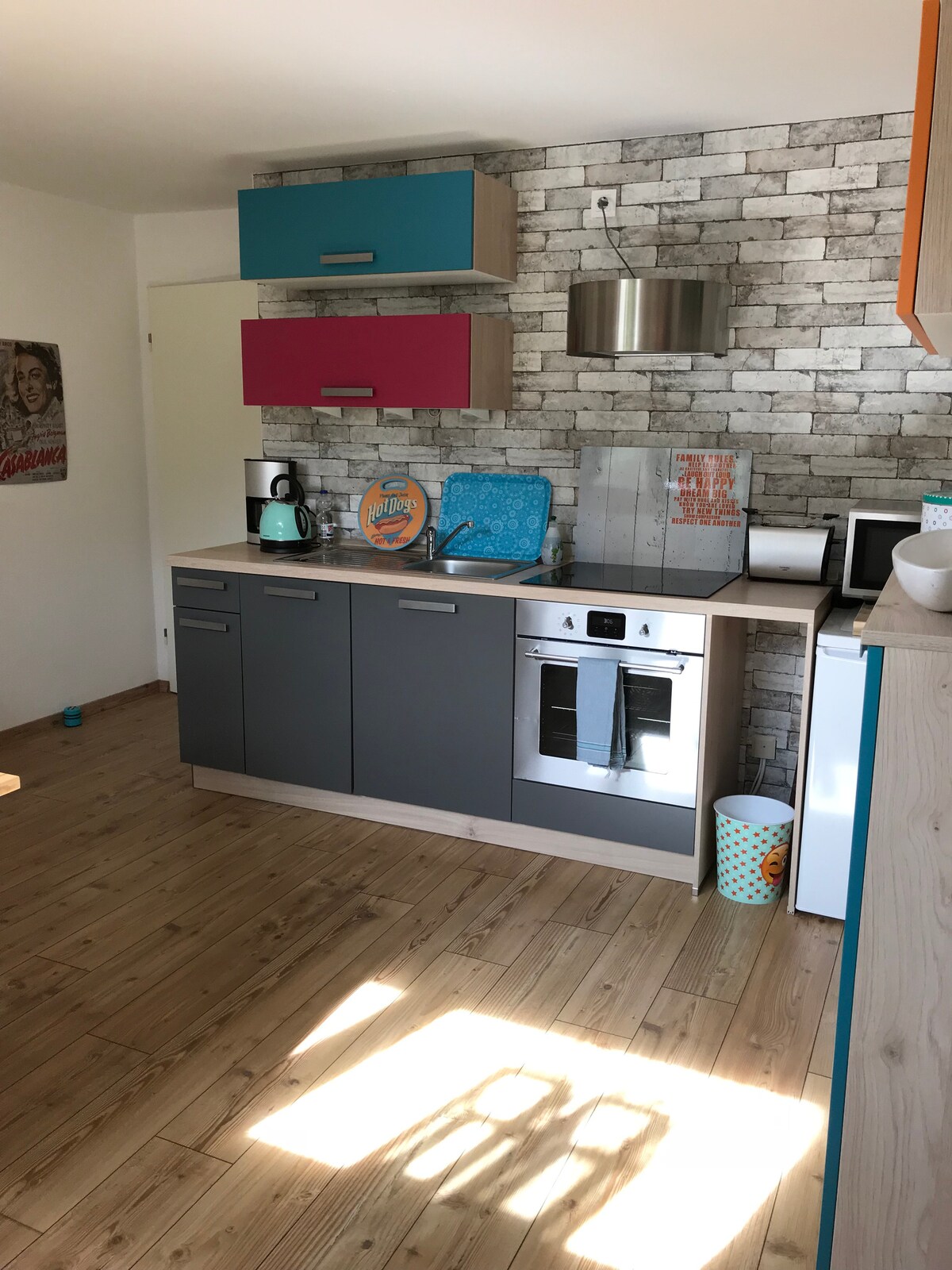 Dobro došli u naš apartman za odmor sa sopstvenom baštom. Stan se nalazi na gornjem spratu i do njega se dolazi zajedničkim stepenicama. Postoji dnevna soba/krevet/radna soba s bračnim krevetom (1,4 x 2 m) i još jedna spavaća soba s dva kreveta. Kupatilo sa tuš-kabinom/kadom i potpuno opremljenom kuhinjom. Poljoprivredna radnja i restoran su u blizini. Do šoping objekata, turističkih sportova i stanice možete doći za 5 minuta automobilom.