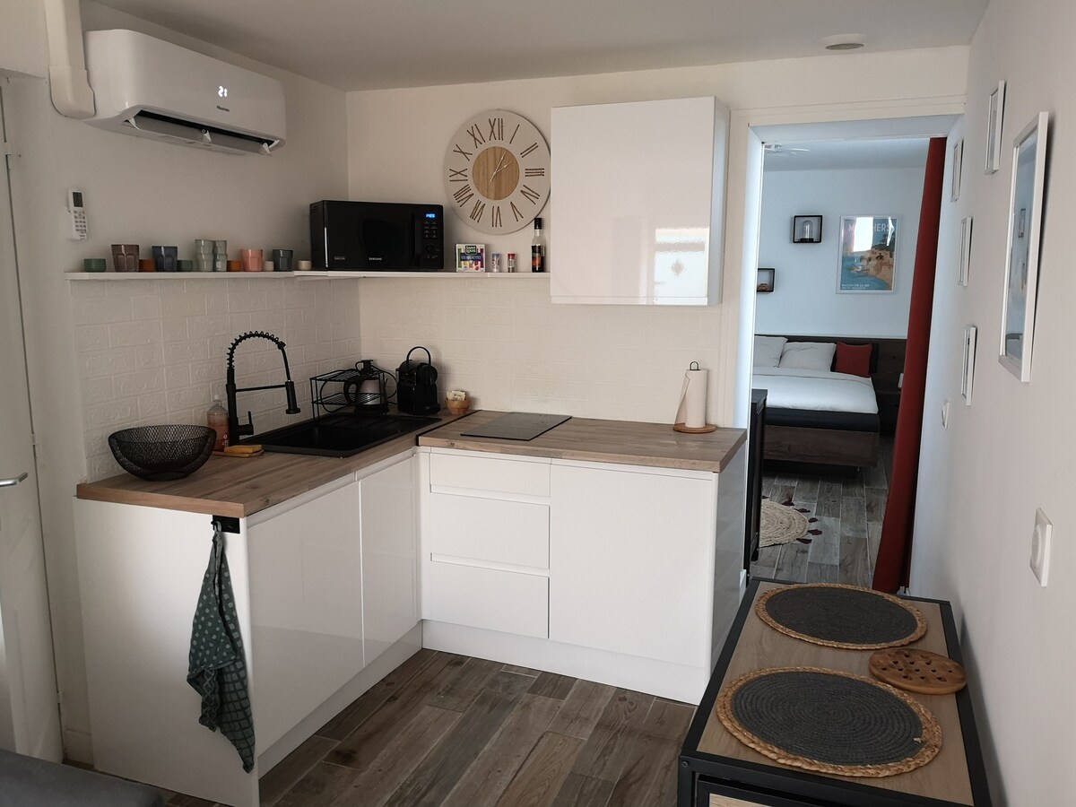 Uživajte u elegantnom, centralnom domu u srcu Meschera. Mali pied-à-terre od 16 m2 koji ima sve što je veliko. Pažljivo namješten, na raspolaganju su vam klima-uređaj, 160 posteljina (2 80 dušeka) za pamćenje, mašinu za suđe i kvalitetnu opremu koja će vam pružiti prijatan boravak.( posteljina u sklopu objekta) Nalazi se u srcu Mesčera, sve je peške. Na kraju privatnog dvorišta i bez stepenica uživajte u miru dok ste blizu letnjih aktivnosti.