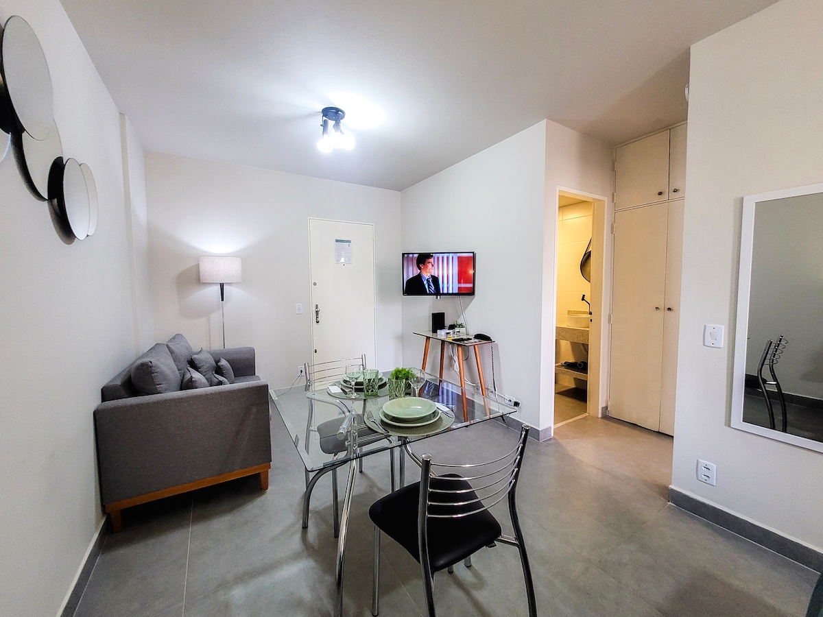Studio moderno, luxuoso ,de 47m², localizado em condomínio residencial à Rua Duque de Caxias, 880, a passos de distância do Cambuí. Próximo a bares, restaurantes, supermercados, cafés e muito mais. Lindamente decorado e equipado, cama tamanho queen, closet, água quente em todas as torneiras, cafeteria Nespresso, 2 aparelhos de ar condicionado, TV 50" giratória (acesso da sala e quarto), ducha higiênica no banheiro e estação de trabalho para duas pessoas. Condomínio com lazer incrível.