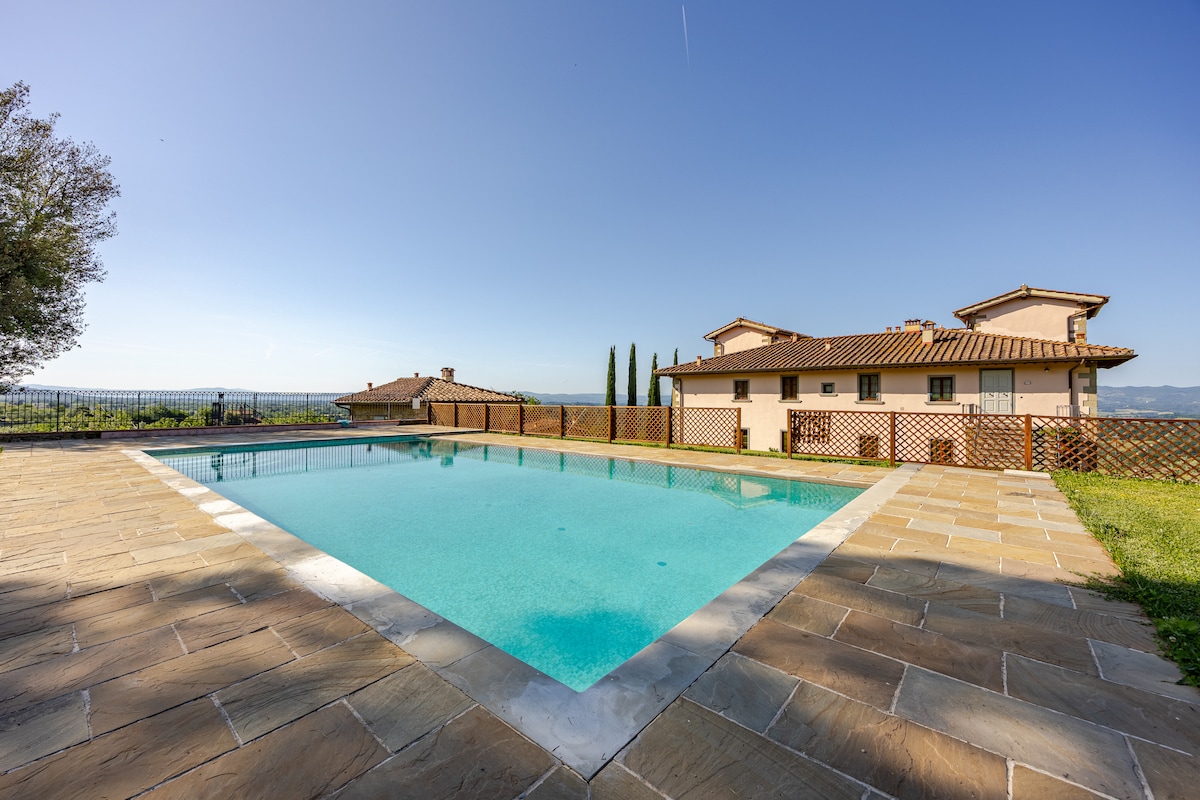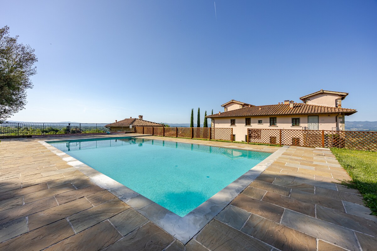 Elegantna trospratna vila u tipičnom toskanskom stilu, vila, koja se nalazi na vrhu brda, u potpunosti je ograđena i ima veliku panoramsku baštu. Lođa i pergola su opremljeni rernom na drva i roštiljem, opremljeni za ručkove i večere u društvu. ✔ Pogodno za kućne ljubimce Autoput ✔ od 5 km, željeznička stanica 5 km, 20 km Firenca. ✔ 3 dvokrevetne sobe + depandans opremljene pametnim TV-om i klima-uređajem ✔ Bazen, kamin, rerna i roštilj ✔ Finska sauna ✔ Wi-Fi