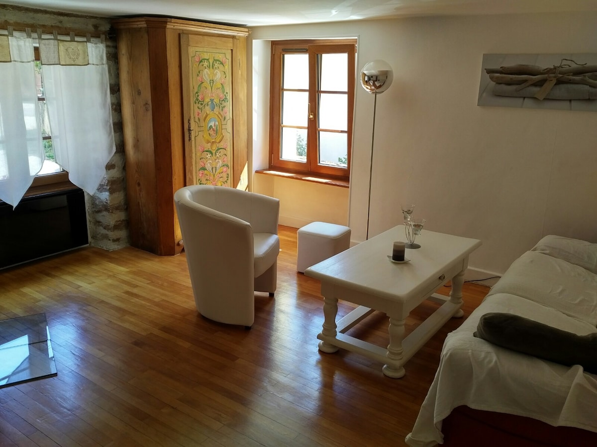 Ispod krova, prostran, svetao, tih i nezavisan prostor na drugom spratu kuće karaktera. Dva velika Véluxa vam pruža prekrasan pogled na Vosges. Iznajmljivanje uključuje glavnu sobu, susednu spavaću sobu sa bračnim krevetom, kupatilo, malu kuhinju i mezanin sa 2 dušeka postavljena na tatamis. Restauracija je urađena sa ekološkim materijalima... i sa mnogo brige i ljubavi! Na raspolaganju vam je bašta u slobodno vrijeme!