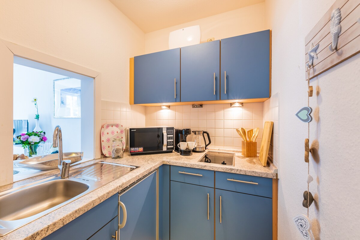 Kleine Maisonette-Ferienwohnung in einer Ferienanlage mit 4 Häusern à 6 Wohnungen. Die Küche ist voll ausgestattet mit Herd, Microwelle, Singlespülmaschine, Toaster, Wasser- und Eierkocher, einer Dolce-Gusto-Kaffeemaschine und Geschirr für bis zu 6 Personen. Ein Kinderreisebett und ein Kinderhochstuhl ist vorhanden. Eine Waschmaschine und ein Trockner ist im Keller vorhanden, diese werden jedoch von allen Bewohnern gegen Entgelt/Münzautomat genutzt. Ein Parkplatz ist vorhanden.