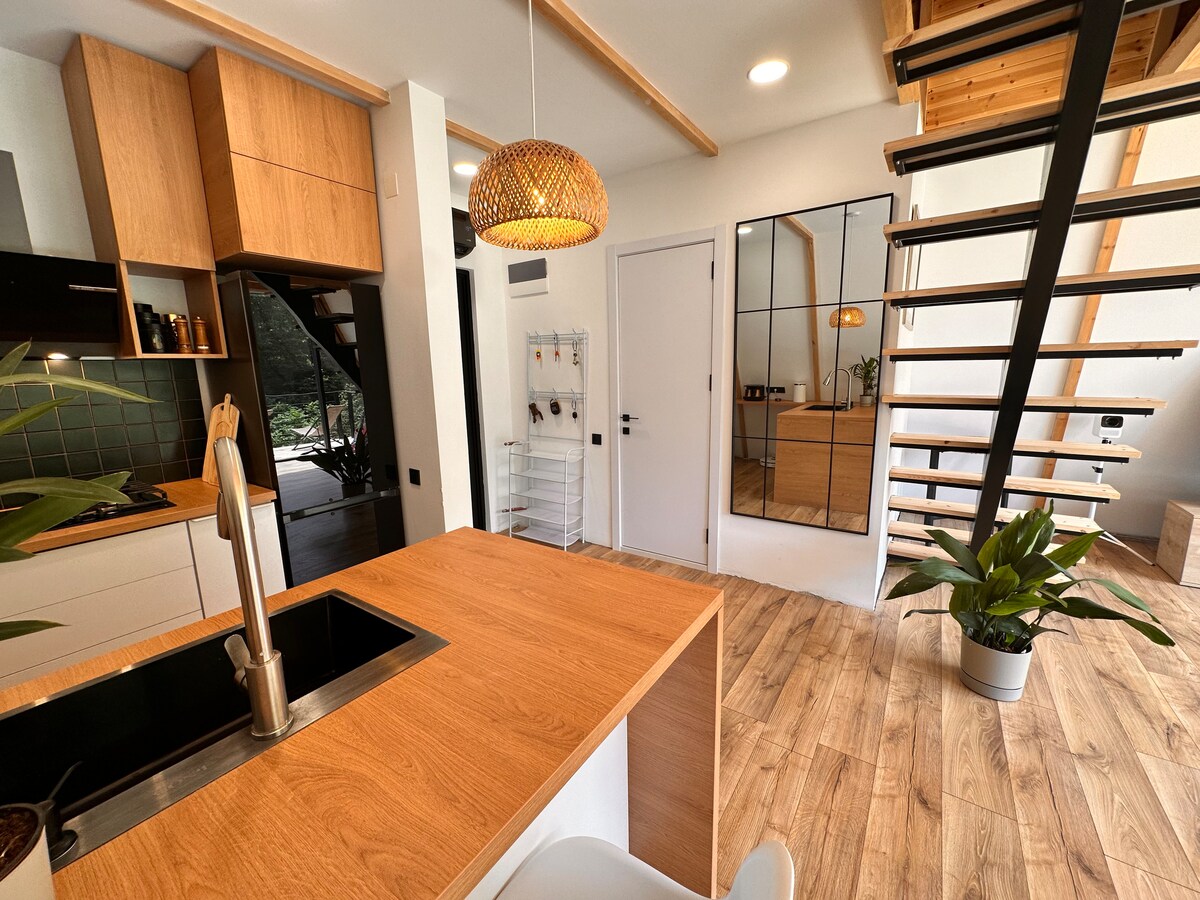 🏡 Udobna seoska kuća u obliku slova A u mirnom selu – idealna za parove, putnike koji putuju sami ili ljubitelje prirode. Uživajte u rustikalnom, ali modernom enterijeru sa spavaćom sobom u potkrovlju, potpuno opremljenom kuhinjom i svijetlim životnim prostorom. Opustite se na privatnoj terasi, pored ognjišta ili u visećoj ležaljci. Obližnji potok dodaje umirujući zvuk tekuće vode vašem boravku. Savršeno za miran odmor okružen prirodom.