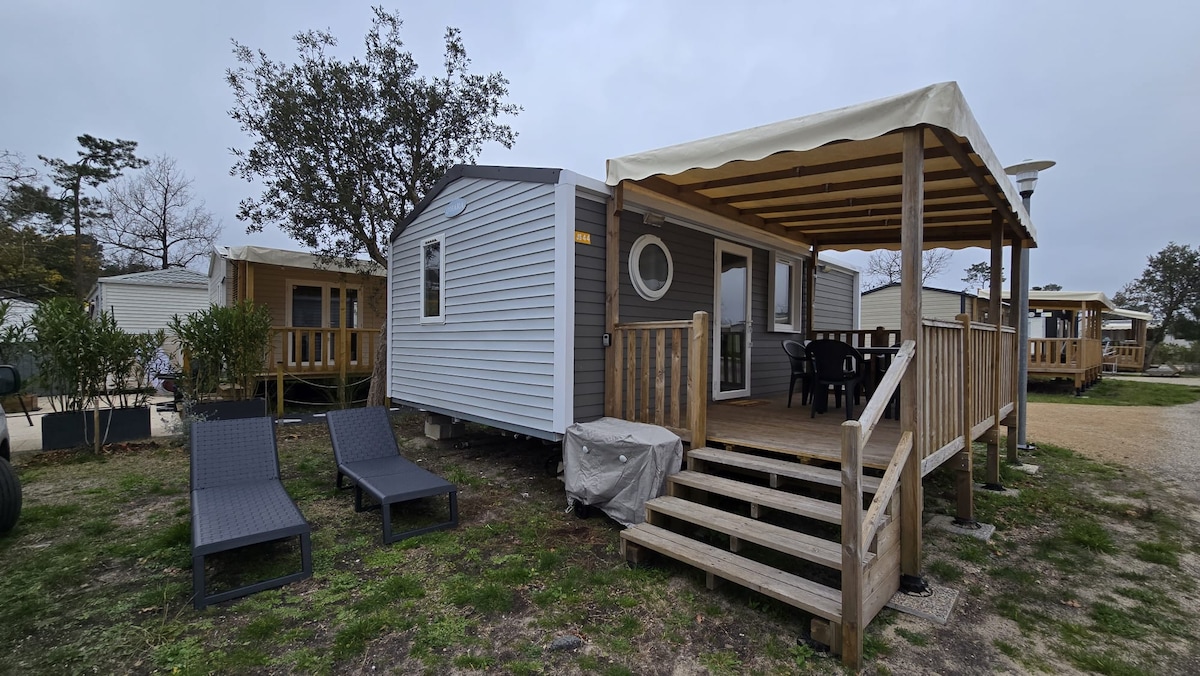 Uživajte sa porodicom ili prijateljima u ovom malom smještaju u čahuri mobilna kućica za do 6 osoba -1 bračni krevet, 2 spavaće sobe 2 kreveta - odsjednite sa klima-uređajem, TV-om - Potpuno opremljena kuhinja WC šolja, kupatilo sa tuš kabinom velika namještena terasa Kamp s 5 zvjezdica s novim vodenim parkom za djecu. klubovi,restoran , iznajmljivanje bicikala, prodavnica suvenira, pristup jezeru, direktno perionica veša itd. posteljina je obezbijeđena