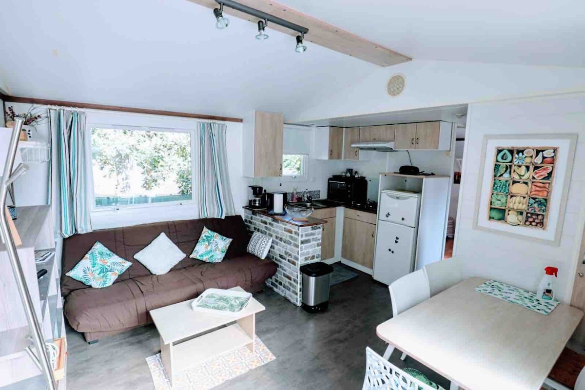 Uživajte sa porodicom ili prijateljima u ovom malom smještaju u čahuri mobilna kućica za do 6 osoba -1 bračni krevet, 2 spavaće sobe 2 kreveta - odsjednite sa klima-uređajem, TV-om - Potpuno opremljena kuhinja WC šolja, kupatilo sa tuš kabinom velika namještena terasa Kamp s 5 zvjezdica s novim vodenim parkom za djecu. klubovi,restoran , iznajmljivanje bicikala, prodavnica suvenira, pristup jezeru, direktno perionica veša itd. posteljina je obezbijeđena