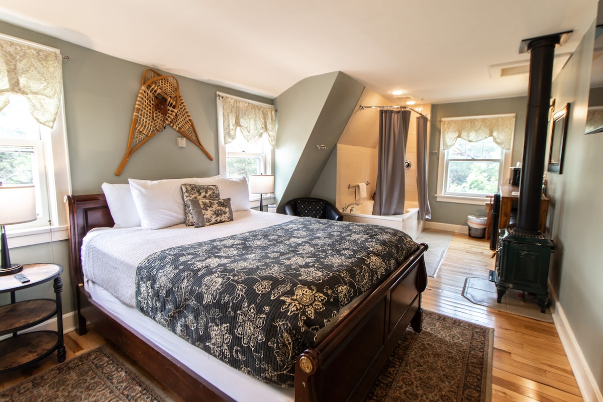 The Creekside Suite of the GG Barnum Mansion, located on the second level, is a bright sun drenched room with a shared deck, King sized bed, leather furniture & modern amenities include a state of the art Samsung Picture Frame SmartTV, a spacious bathroom featuring a jetted bathtub and shower, a refrigerator, microwave, and coffee maker, This property is intended for adult getaways, no persons under the age of 16 are permitted.