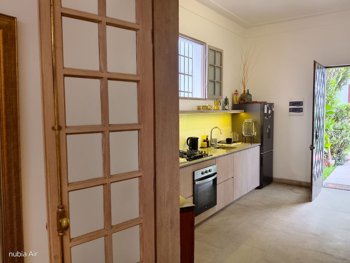 Casa única. Ubicada en el corazón turístico de Miraflores, a dos cuadras del mar, en una de las pocas quintas clásicas de la zona. Situada en un vecindario residencial pintoresco y ecléctico, goza de tranquilidad, techos altos, una pequeña terraza y mucho verde. Recientemente remodelada. Cocina equipada, 1 habitación con su baño. Cama King. La decoración de sala y comedor combina estilos clásico y moderno en espacios cómodos y acogedores.