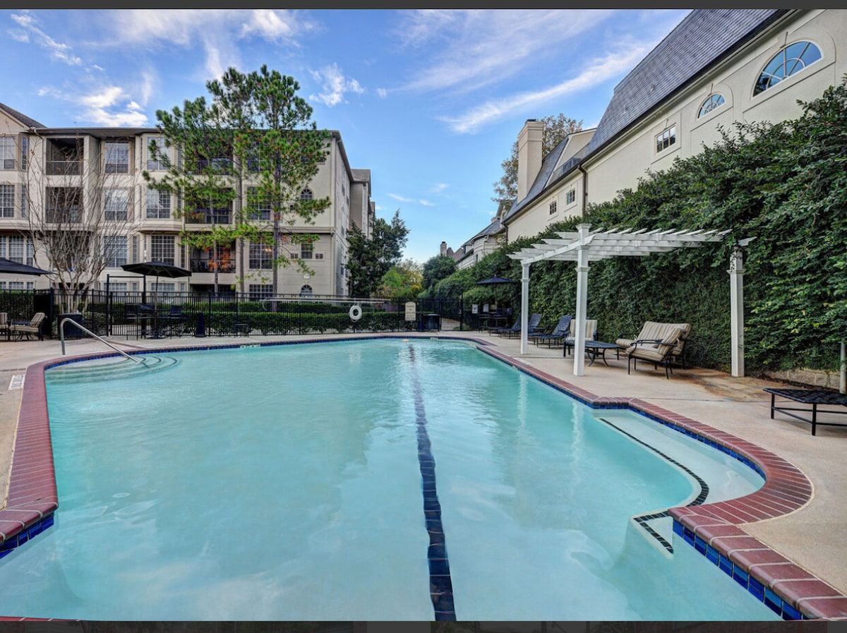 Mirno se odmorite u ovom luksuznom apartmanu s 1 spavaćom sobom i 1 kupatilom, sa unutrašnjim dvorištem pored bazena, koji se nalazi u objektu Domain u stambenom kompleksu Kirby. Ako želite da rezervišete u blizini stadiona NRG na pješačkoj udaljenosti od RODEA, ovo je savršeno mjesto! Udaljeni smo kratkih 15 minuta hoda do parka NRG i kratkih 7 minuta vožnje do Teksaškog medicinskog centra. Nalazimo se u blizini mnogih dodatnih popularnih destinacija u Hjustonu, uključujući muzejsku četvrt, zoološki vrt u Hjustonu i mnoštvo restorana.