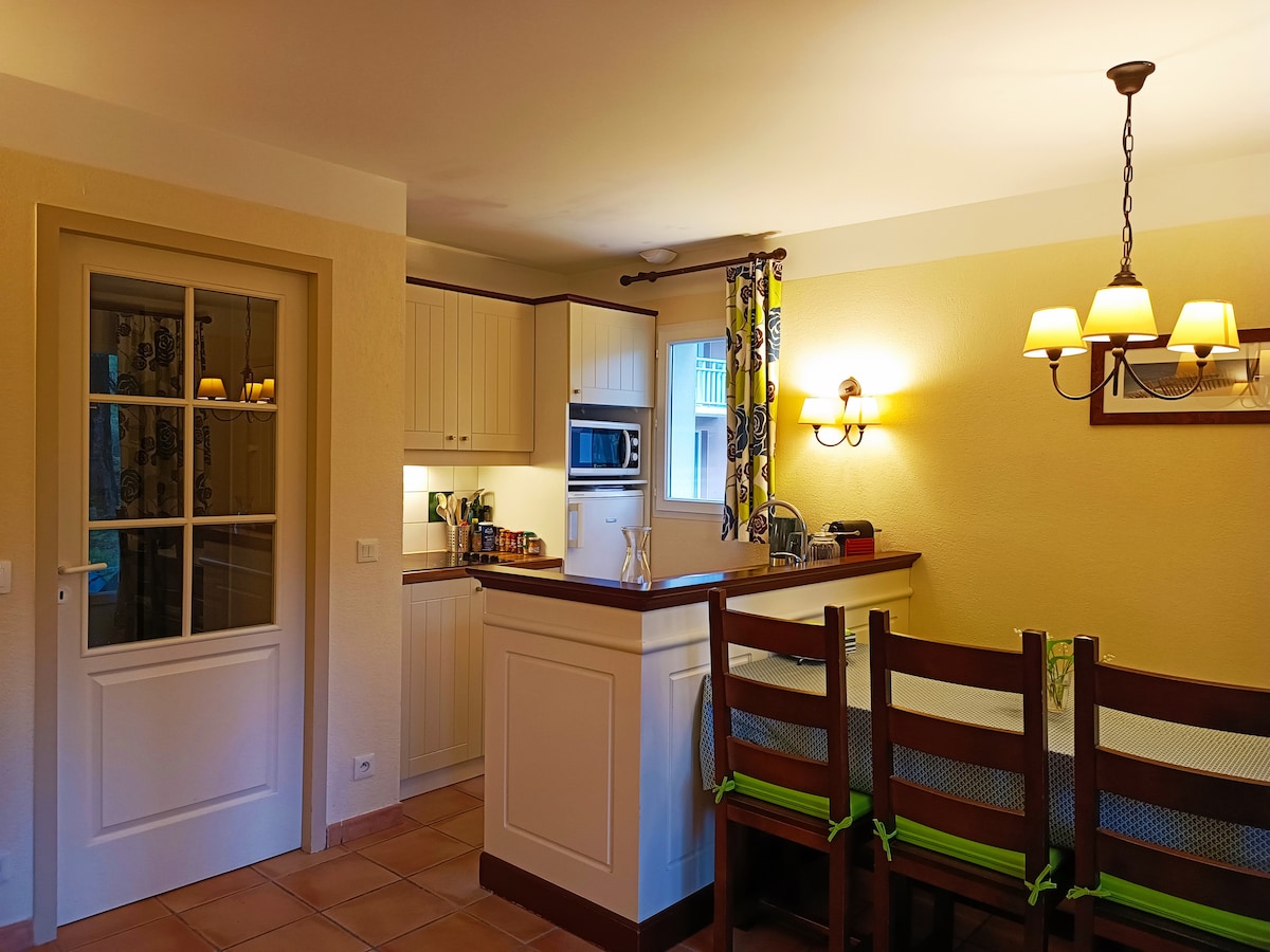 Smještena u zelenom okruženju, u parku od 70 ha, ova renovirana seoska kućica od 25 m2 će vas očarati svojim opuštajućim okruženjem, terasom od 27 m2, pogledom na jezero, među borovima. Uključena su dva bicikla za odrasle, posteljina, peškiri, čišćenje, planča . Selo sous les Pins je selo za odmor sa mnogo sadržaja: bazeni, mini golf, teniski tereni, gradski stadion, igralište, teretana, amfiteatar, barovi, restoran, supermarket i sezonska zabava.