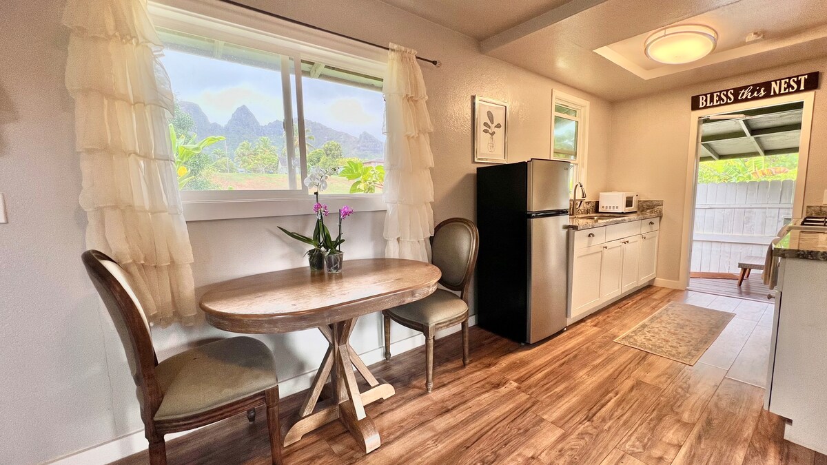 Escape to this private Hawaiian paradise, tucked away in a family friendly neighborhood minutes from Hanalei. Walking paths to shops, beaches, outdoor markets, cafes and grocery store are out the front door. Mornings on the lanai promise bird songs and tranquility as you sip your coffee or maybe you'll catch a few waves at Hanalei Bay before breakfast. Evenings dazzle here as you unwind and relax under twinkling cafe lights. You'll come for the beach but you'll stay for the rainbows.
