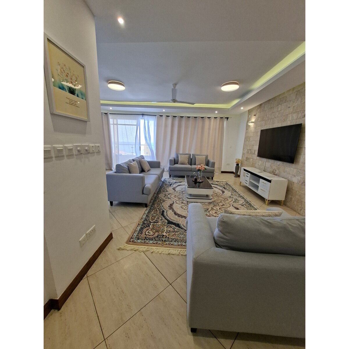 Welcome to this newly furnished apartment with Air Conditioning (AC) & ceiling fans in all the rooms. Hot shower. Smart TV. Free Netflix. Free cleaning after every 2 days. Washing machine & Dryer in balcony. Amenities: Gym, Basketball court, Games room, Children’s playground, Beautiful garden seating area, Olympic-size swimming pool. Perfect for both tourists and business travelers! You will be close to everything you need at this secure centrally-located property in Mombasa.