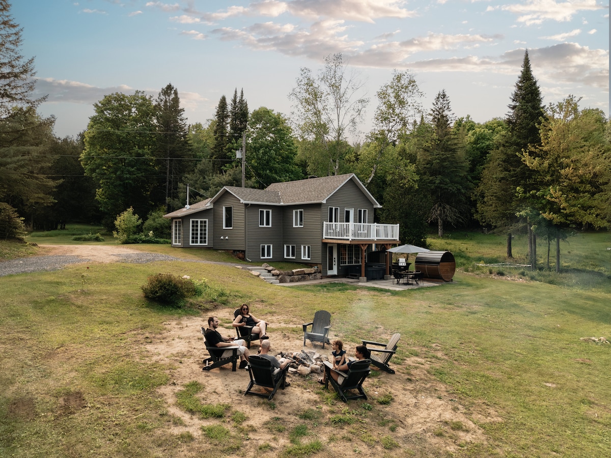 La nature à l'état pur! Nous vous offrons un chalet fraichement rénové avec un petit lac totalement privé et un immense terrain où vous pourrez vous balader dans des sentiers privés. Si jamais vous voulez quitter ce paradis, Tremblant est à 45 min, le parc Oméga 25 min, le lac Simon 15 min, Gatineau 1h et Montréal 1h30. Tout a été pensé pour assurer votre bonheur! Spa, sauna, coin travail ou détente, immense salon familial avec table de shuffleboard. Un endroit où créer des souvenirs!