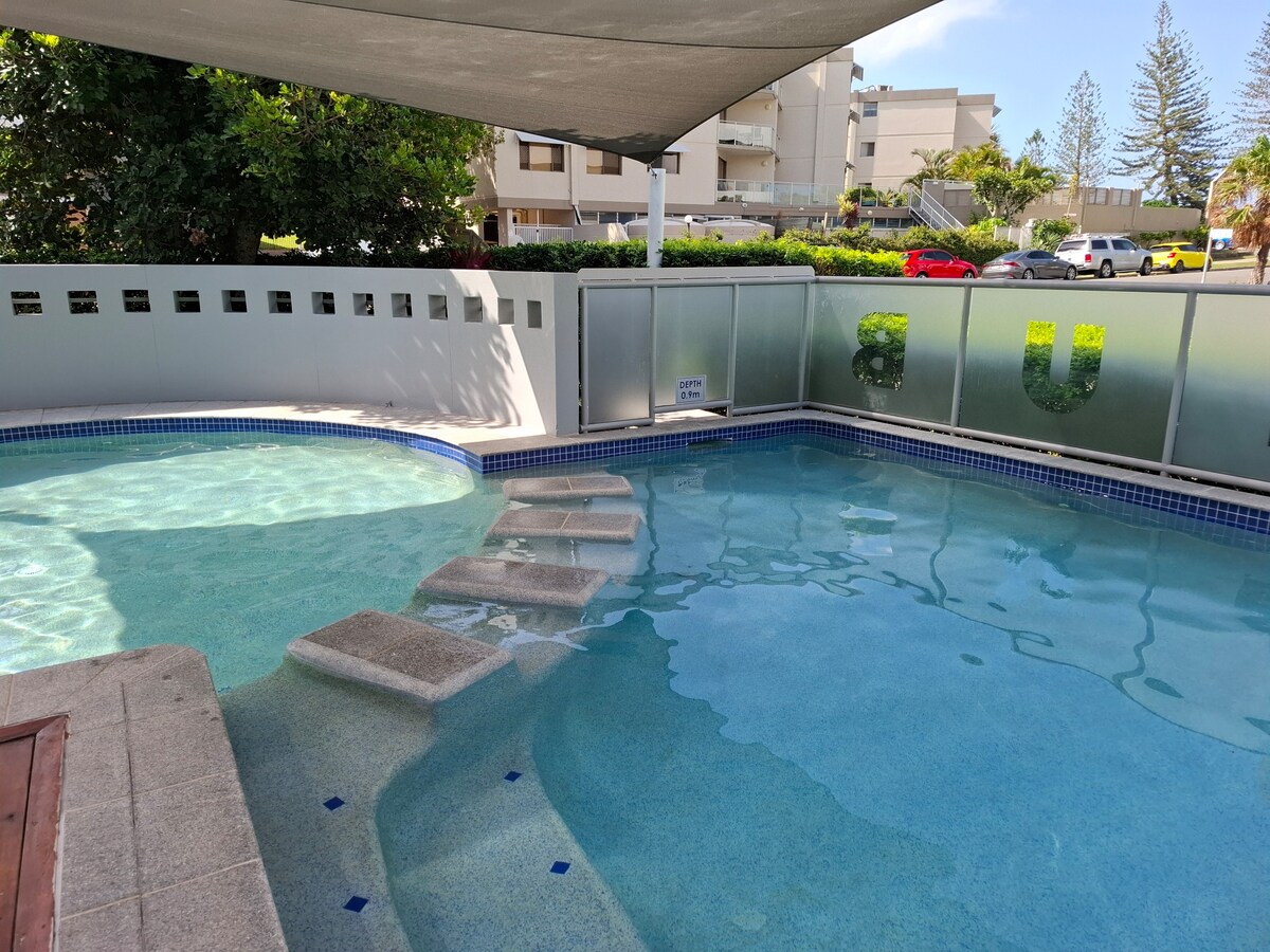 Largest lagoon pool,hot pools, spas on the coast ! cosy one bedroom unit Suited for couples 2 adults and up to 2 children. Two person deep bath and shower combo.! The sofa bed is suitable for children only. full kitchen,OCEAN VEIWS! .situated 100metres from beach and walking distance to moloolaba. restaurants right at your door step, pizza,sushi, and Alex surf club 1 minute walk.watersides,play area for children, gym,free use of BBQ's skate park accross the road,it's a beautiful oasis to relax.