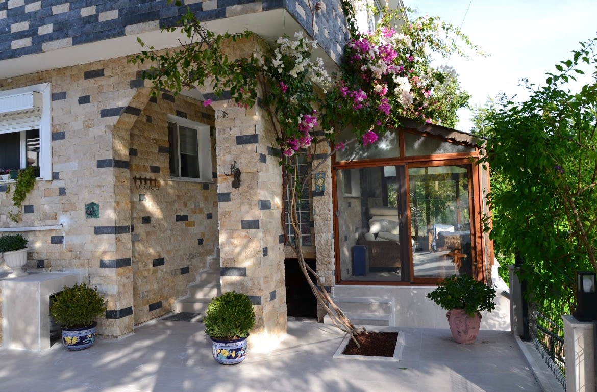 Samostalna vila sa pogledom na more, 2,5 sprata, 4 sobe, 4 bračna kreveta, 1 krevet za jednu osobu i bašta od 200 m2 je u potpunosti namenjena našim gostima. U zimskim mesecima postoji peć na drva, radijator i klima-uređaj. Lokacija ima svoju plažu, a najbolji zalivi u regionu (Manal, Ajbaligi, plaža Korsan, plaža Ardič, Bejaz Kajalar) udaljeni su 5–10 minuta vožnje automobilom.