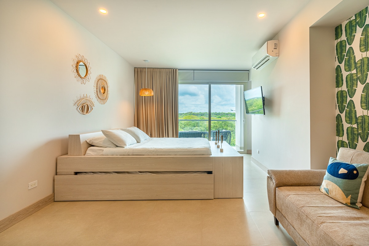 Prostran i elegantan stan sa slikovitim pogledom na Ciénaga de la Virgen i direktnim pristupom plaži. Uživajte u velikom balkonu, brzom bežičnom internetu, TV-u i vrhunskom zvučnom sistemu Bose. Savršeno za opuštanje ili rad na daljinu. Kompleks ima 3 bazena (uključujući i jedan za djecu), đakuzi i potpuno opremljenu teretanu. Idealno za parove, porodice ili putnike koji putuju sami i traže udobnost, prirodu i praktičnost. Promovišemo bezbjedan prostor pun poštovanja za sve goste.